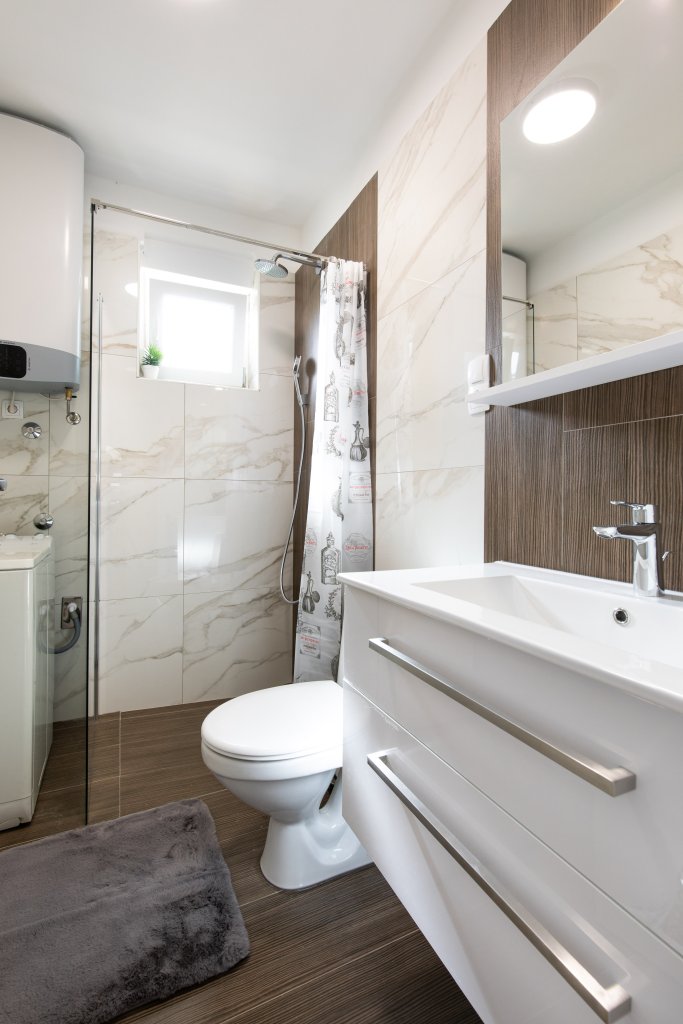 Kupaonica ima prozor, walk-in tuš, toalet, umivaonik, perilicu rublja i sušilo za kosu