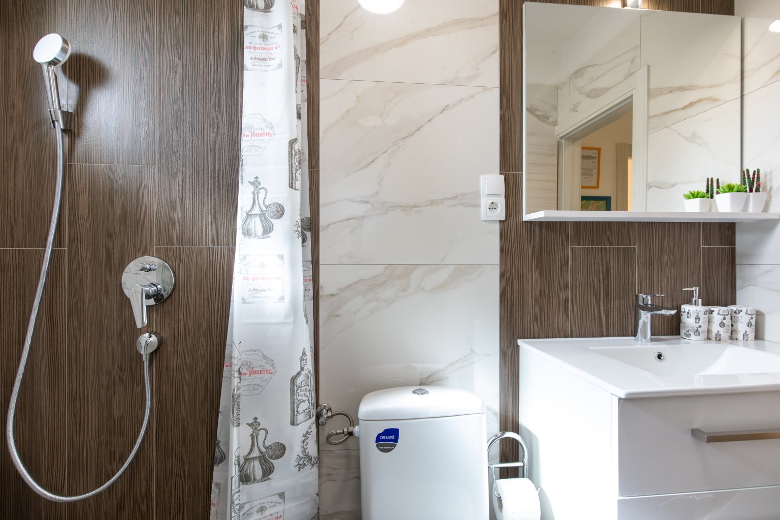Kupaonica ima prozor, walk-in tuš, toalet, umivaonik, perilicu rublja i sušilo za kosu
